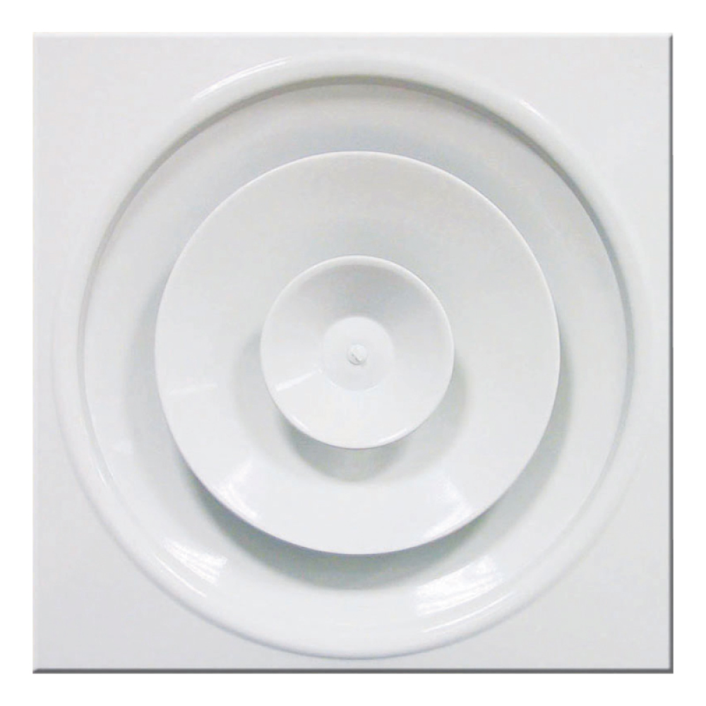 Kruhový anemostat s nastavitelným středovým kuželem. Anemostat lze dodat také v provedení se čtvercovou deskou určenou pro kazetové stropy (typ S).