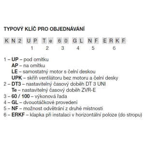 je z ABS, barva bílá. Provedení AP má výtlak směrem dozadu, průměr výtlačného hrdla 50 mm s přiloženým přechodem na 75 mm (přechod na 100 mm možno objednat). Provedení UP má boční výtlak, průměr výtlačného hrdla 74 mm. Montáž na stěnu, pod omítku nebo do podhledu. Čelní mřížka obsahuje filtr a tlumič hluku. Ventilátory obsahují zpětnou klapku.