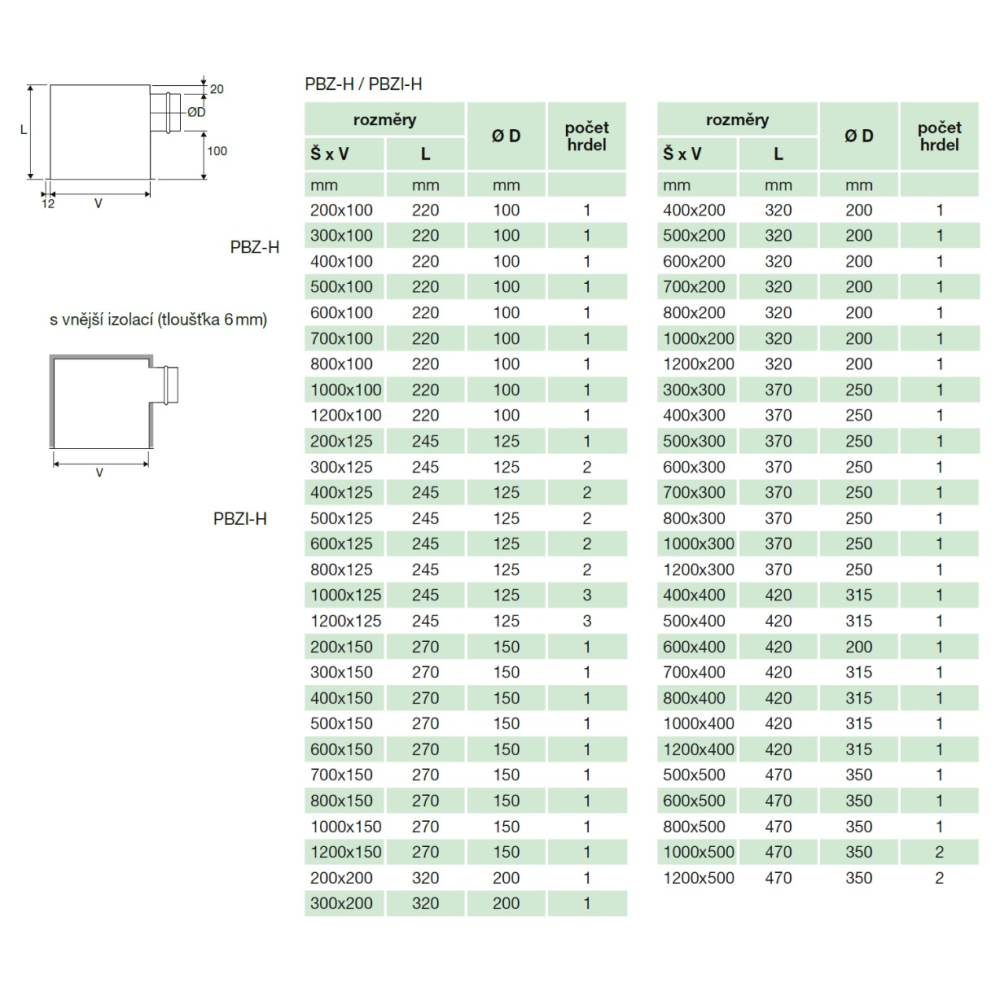 Plenum box z ocelového pozinkovaného plechu pro snadnou instalaci přívodních nebo odvodních vyústek a mřížek. Dostupné jsou varianty s vertikálním (PBZ-V) nebo horizontalním (PBZ-H) připojením. Připojovací hrdlo je uzpůsobeno pro napojení flexibilního potrubí. Dle velikosti boxu je stanoven počet připojovacích hrdel (viz tabulka).