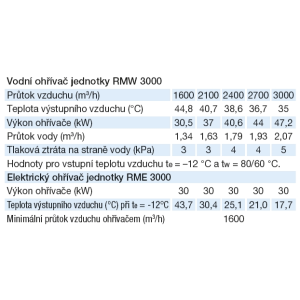 Vodní ohřívače jsou navrženy pro teplotní spád topné vody dT = 20 K (80/60 °C) pro vstupní teplotu vzduchu te = –12 °C/90 % r.v. při nominálním průtoku vzduchu. Elektrické ohřívače jsou navrženy pro vstupní teplotu vzduchu te = –12 °C/90% r.v. při nominálním průtoku vzduchu a jsou vybaveny provozním a havarijním termostatem.